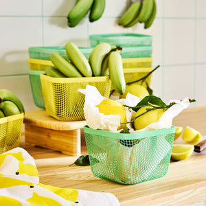 Muchos alimentos tienen que conservarse a temperatura ambiente en un lugar donde circule el aire para realzar su sabor y durar más. La cesta de almacenaje de comida IKEA 365+ es bonita y práctica, ya que permite ver el contenido a través de la malla.