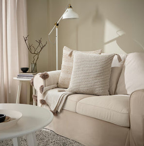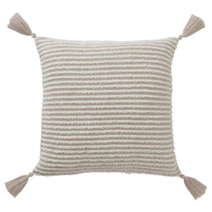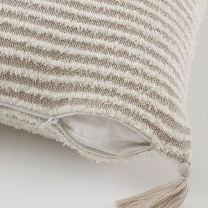 Vistosas borlas y pequeños nudos blancos que crean un estampado de rayas estrechas. Esta funda de cojín de poliéster en color natural es agradable al tacto, queda genial y es fácil de quitar y lavar.