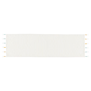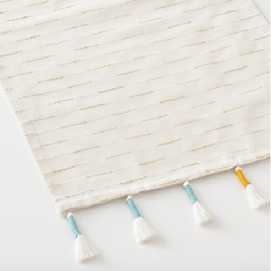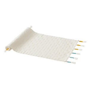 Las vistosas borlas de los extremos también incluyen hilos en azul y naranja que combinan con otros textiles de la colección GOKVÄLLÅ.