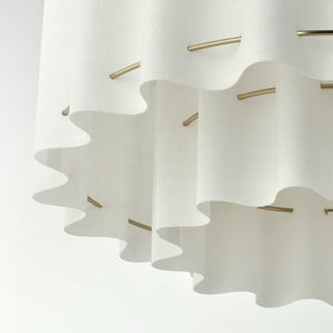 Esta lámpara de techo, con una pantalla de tela ondulada y detalles de color latón, presenta un estilo suave. Ideal para colgar encima de una mesa de comedor o en el dormitorio.