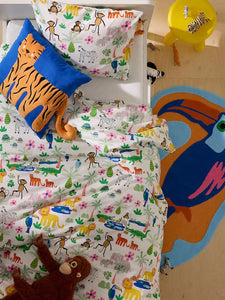 Este conjunto de funda nórdica de algodón/viscosa está repleto de animales de la selva, como tigres, leones, monos y tucanes.