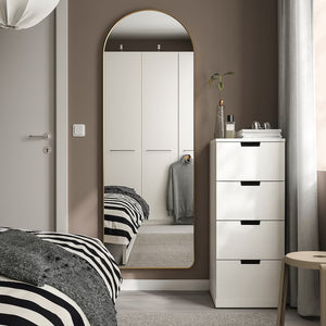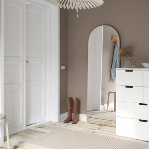 Decora con espejos para aportar vitalidad y profundidad a la habitación. El espejo LINDBYN tiene un marco dorado con la parte superior redondeada, un diseño sencillo y un aspecto suave pero elegante. Cuélgalo en la pared o colócalo en el suelo.